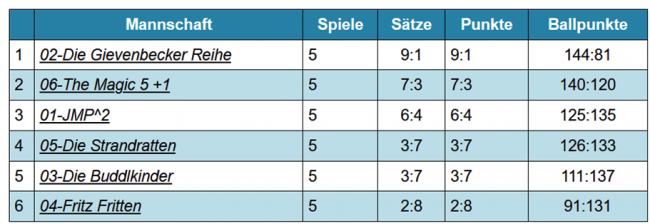 Sechs Teams mit über 50 Spielerinnen- und Spielern… In der Vorrunde: jeder gegen jeden, 2 Sätze bis 15; gespielt wird auf 2 Feldern im 30 Minutentakt.