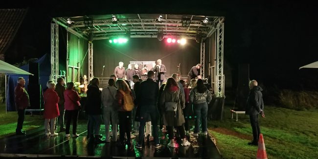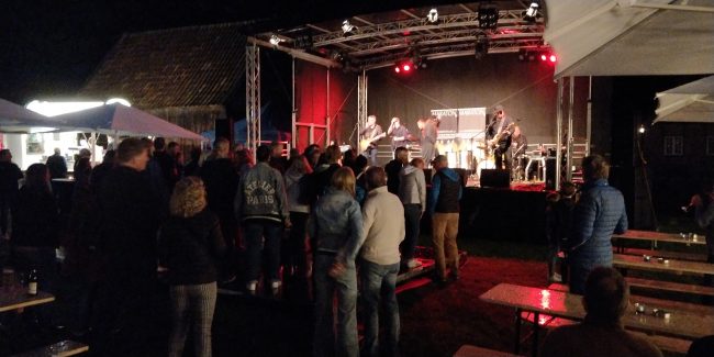 Zum krönenden Abschluss des Tages, fand die Abendveranstaltung im Freilichtmuseum Mühlhof statt. Hier wurden die Gäste mit sehr leckerem Essen begrüßt und „The Speedos“ unterhielten alle Gäste an den Tischen mit ein wenig Musik. Ein kurzer Regenschauer wurde gekonnt ignoriert. Als dann der Wettergott meinte, etwas mehr Wasser auf die Teilnehmenden zu gießen, flüchteten einige in den Gräftenhof und feierten dort ausgelassen weiter. Parallel dazu hatte „derChor“ von der BSG Bezirksregierung ihren Auftritt auf der Hauptbühne umrundet von einer kleinen Airshow. Danach fing die Band Maraton an und sorgte für eine ausgelassene Stimmung. Der aufziehende Regen wurde gekonnt ignoriert.